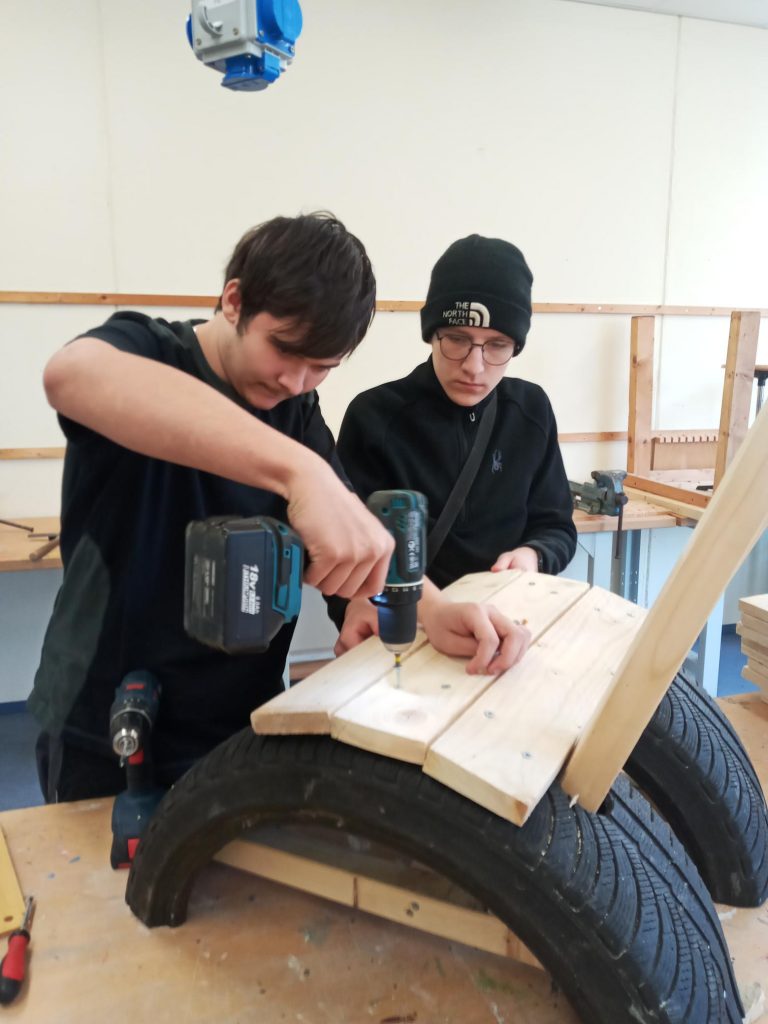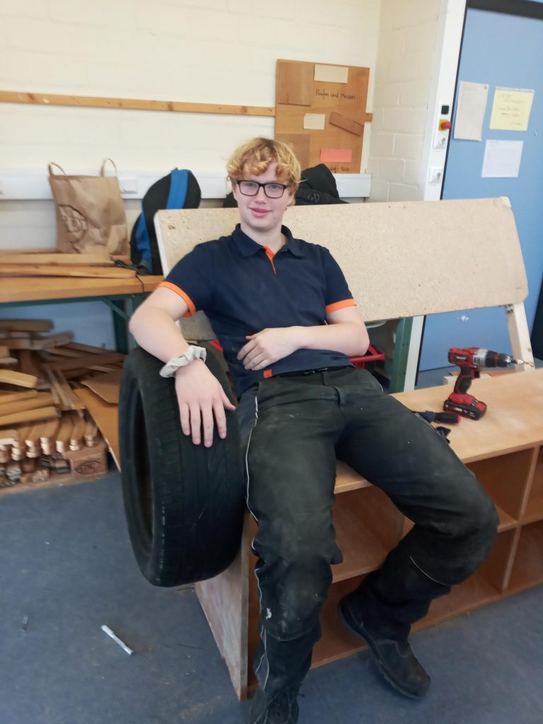 Die Projektprüfung, die Mitte Januar durchgeführt wurde, war ebenso sehr erfolgreich. Alle Prüfungsprojekte, in denen PUSCH-Teilnehmende Möbelstücke gebaut bzw. lecker gekocht haben, wurden zum Großteil gut benotet. Dazu gehörte ein Projekt, in dem Dominik, Maxi, Gabriel und Fabio eine Bank und einen Sessel aus einem alten Buchregal und Autoreifen gebaut haben. Nachhaltigkeit und Upcycling pur!