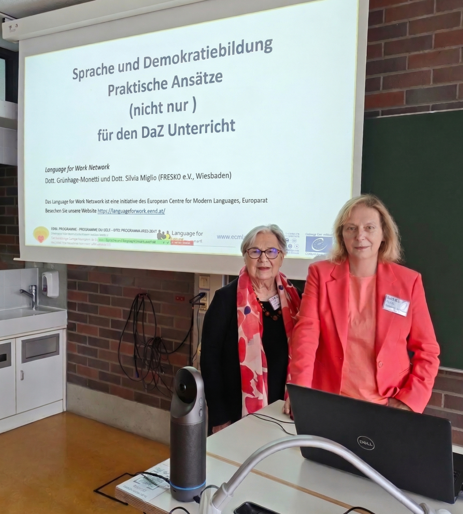 Dott. Silvia Miglio (FRESKO e.V.) und Dott. Matilde Grünhage-Monetti zeigten in ihrem Workshop „Sprache und Demokratiebildung – Praktische Ansätze (nicht nur) für den DaZ-Unterricht“, wie demokratische Grundwerte aktiv in die Sprachvermittlung integriert werden können. Sprache ist dabei weit mehr als reine Kommunikation: Sie ist das Fundament für Partizipation, das Werkzeug zur aktiven Wahrnehmung eigener Rechte und die Basis für ein respektvolles Miteinander. Gerade in einer Zeit, in der der gesellschaftliche Zusammenhalt und demokratische Werte zunehmend in den Fokus rücken, wird deutlich, dass Sprachkompetenz untrennbar mit zivilgesellschaftlichem Engagement verknüpft ist. Dazu gehört auch die Vermittlung gezielter Sprachmittel, die Handlungssicherheit geben, um in herausfordernden Situationen souverän zu reagieren und demokratische Werte aktiv zu vertreten.