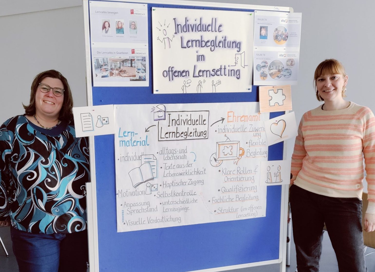 Die beiden Projektmitarbeiterinnen des Projekts Lerncafés bewegen freuten sich über die gute Zusammenarbeit mit den anderen ESF+-Projekten bei der Vorbereitung und Durchführung der Sitzung der Fachgruppe: Bildungswerk der Hessischen Wirtschaft e. V. in Darmstadt, Grundbildungszentrum Volkshochschule Hanau, Grundbildungszentrum Volkshochschule Offenbach, Volkshochschule Frankfurt a.M., ZAUG gGmbH in Gießen.